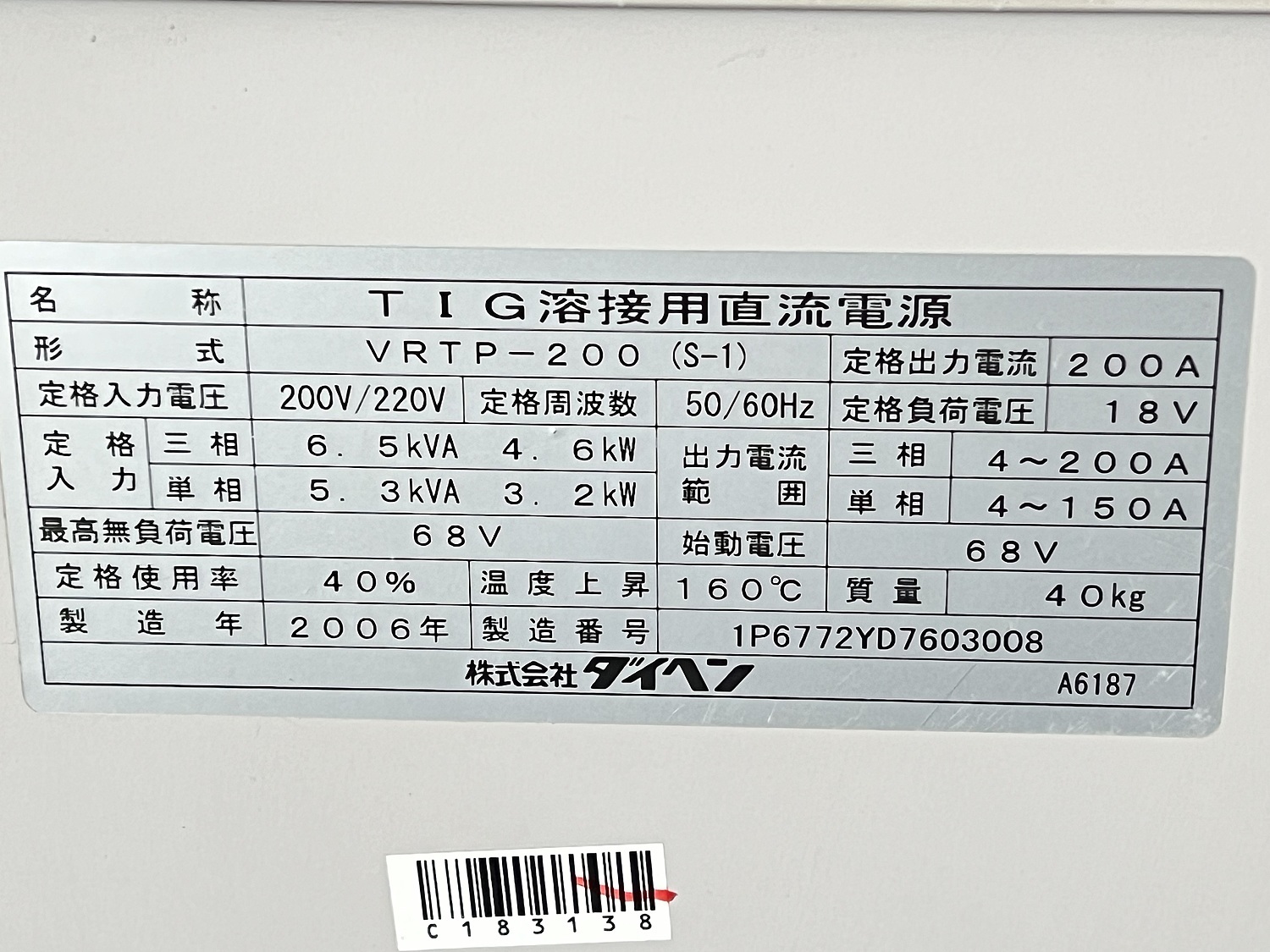 TIG溶接機/ダイヘン/VRTP-200(S-1) [C183138] ¥ 200,000 |