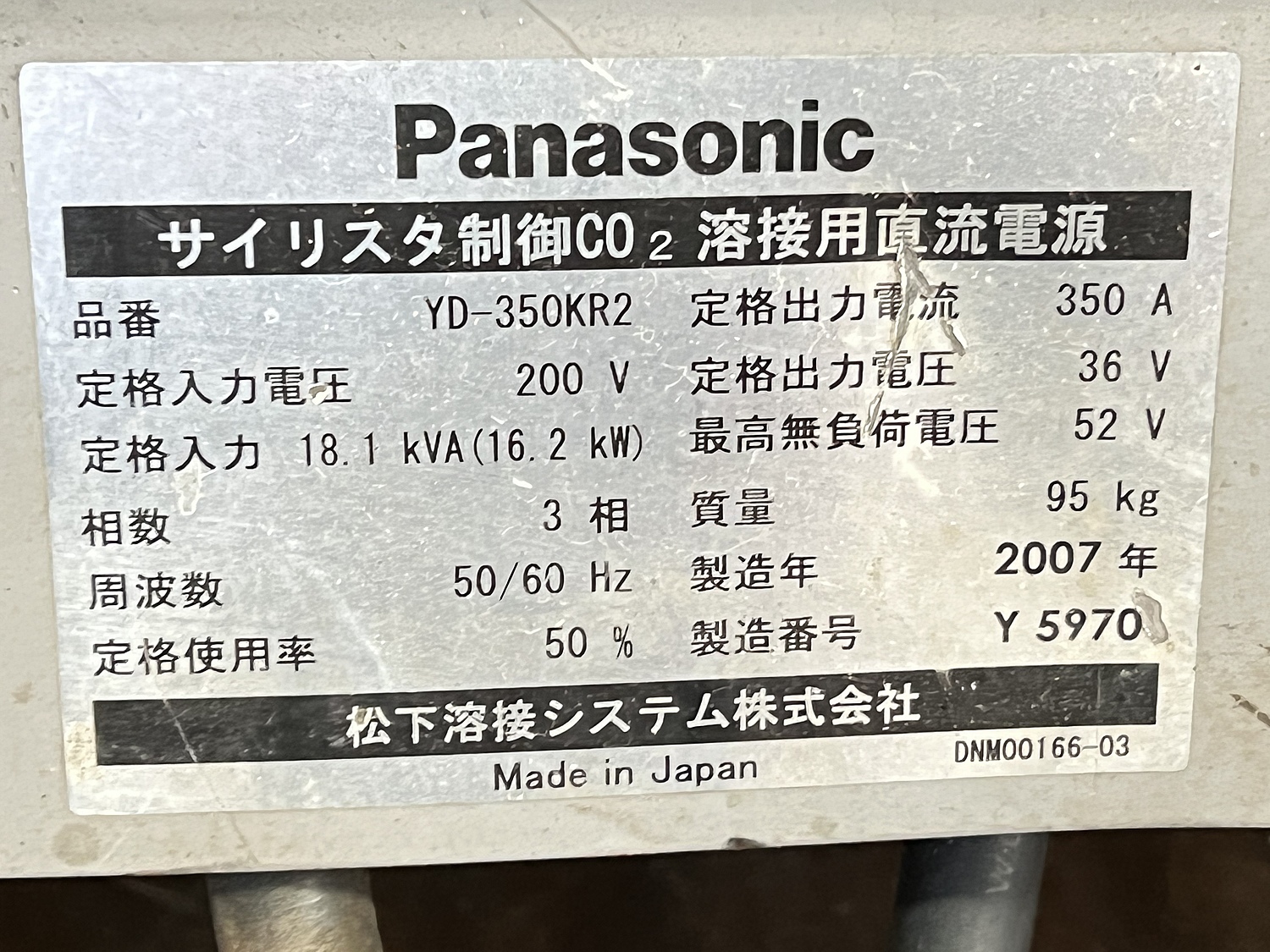 三相200V 50/60Hz 定格出力電流350A 定格出力電圧36V 定格入力18.1kVA(16.2kw) 最高無負荷電圧52V 定格使用率50% 内容と現品に相違がある場合は、現品を優先させていただきます。 |