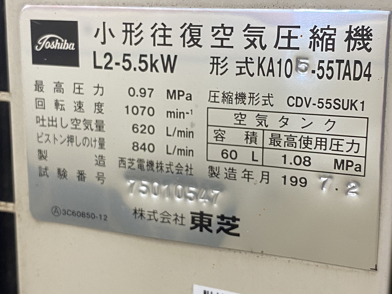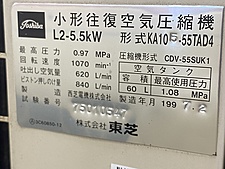 7馬力(5.5kw) ドライヤー付 最高圧力0.97MPa 吐出空気量620L!min タンク容量60L 運転時間2835.9Hr